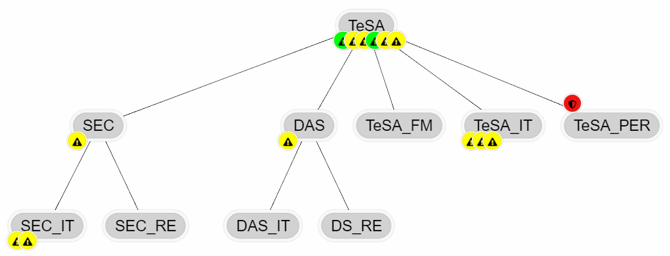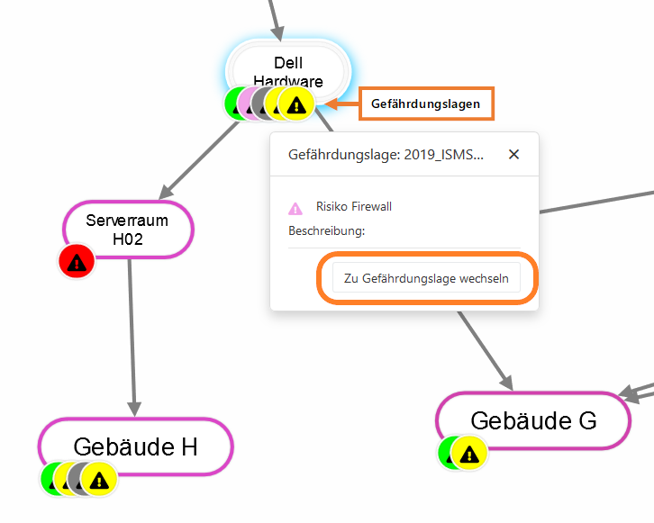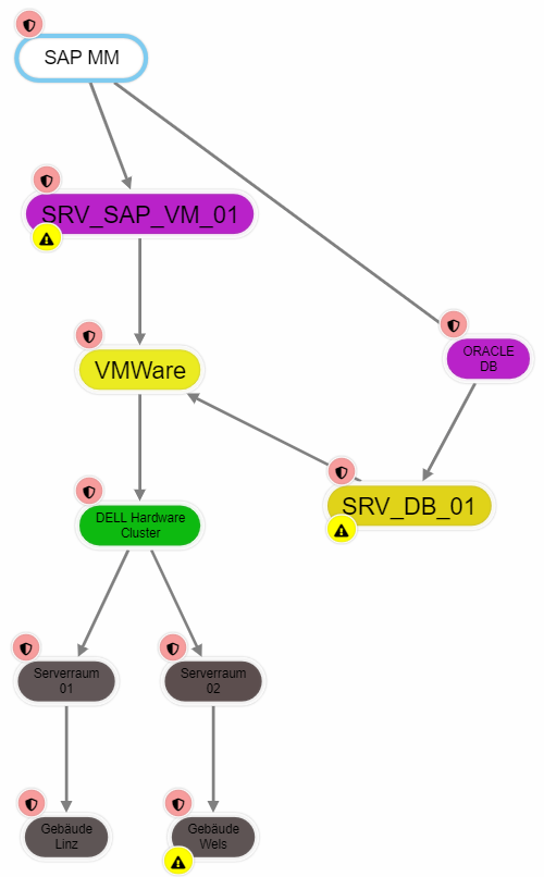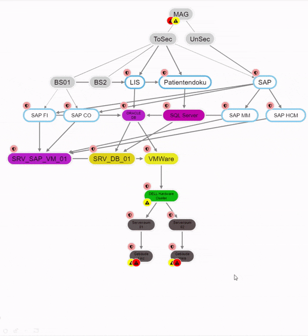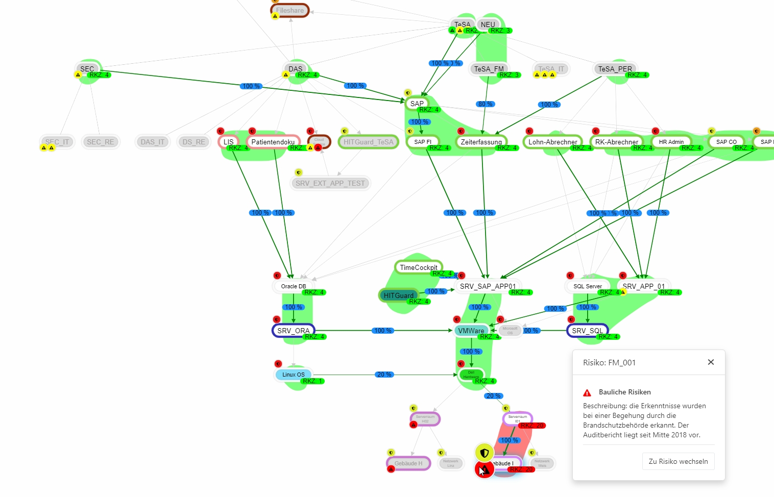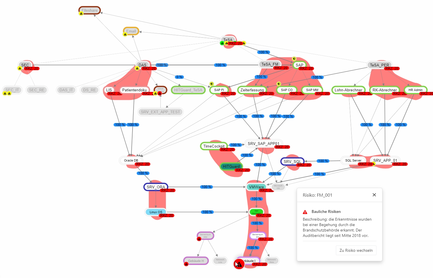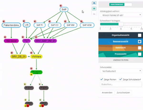 Es besteht die Möglichkeit zu analysieren, wie Risiken auf die gesamte Struktur wirken. Dabei kann auch untersucht werden, wie diese mit den einzelnen Schutzzielen zusammenhängen. Dadurch lässt sich schnell erkennen, welche Folgen ein Risiko auf andere Entitäten hat.