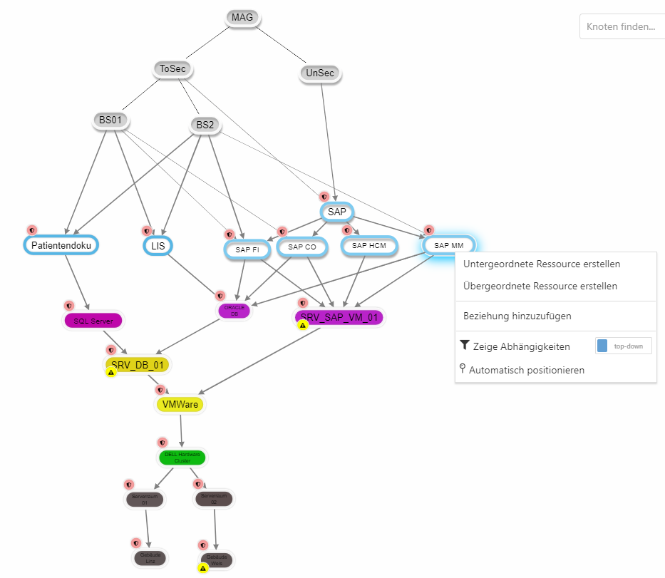 Ein Beispiel zum Verdeutlichen: Ich interessiere mich gerade nur für die Ressource SAP MM und möchte wissen, wovon diese Ressource abhängt, ich tue mir aber schwer dies zu erkennen, da so viele Knoten angezeigt werden.