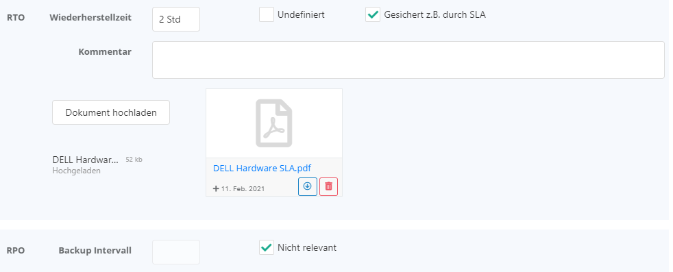 - Für RTO gibt es zusätzlich noch die Option, dass die Wiederherstellzeit von Ressourcen Dritter z.B. durch eine SLA gesichert sind. Es kann diese SLA bei der Ressource hinterlegt werden.