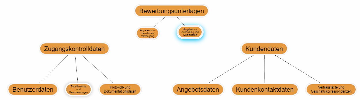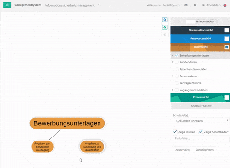 - Die Datensicht lässt erkennen in welchen Organisationseinheiten, welche Daten verarbeitet werden, wer die Data Owner sind und wie die Daten klassifiziert sind (Datenklassen bzw. Unterscheidung ob personenbezogene oder nicht personenbezogene Daten). Weiters lässt die Darstellung erkennen, durch welche Ressourcen die Daten laufen und in welchen Prozessen sie verarbeitet werden.