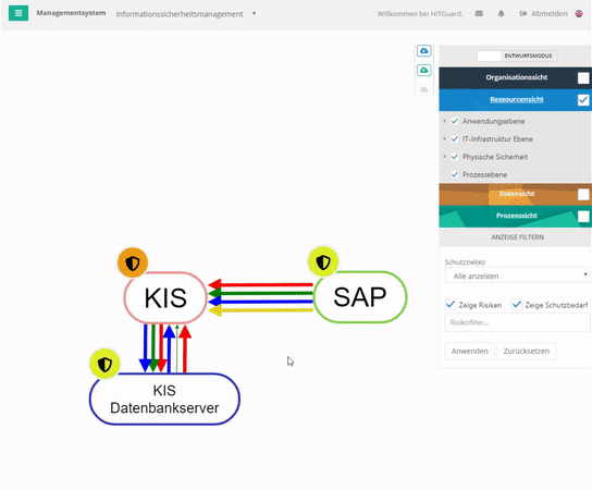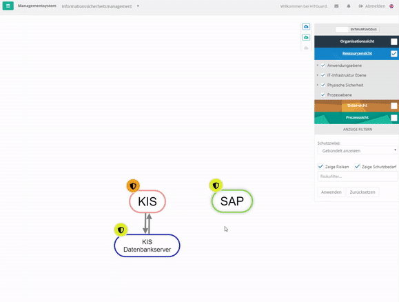 Im Entwurfsmodus können Sie Elemente aus den ausgewählten Sichten in Verbindungen setzen und ihre Abhängigkeiten auf Basis von Schutzzielen definieren. Sie können aber keine Verbindungen oder Schutzziel-Gewichtungen bearbeiten, wenn diese durch eine Schutzbedarfsanalyse definiert wurden. Um diese zu bearbeiten führen Sie eine neue Schutzbedarfsanalyse durch.