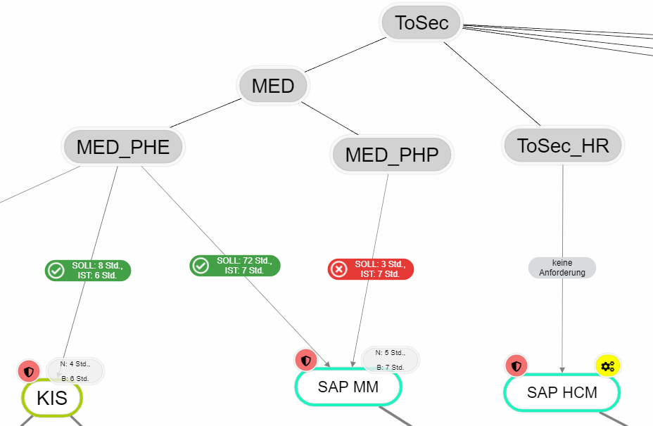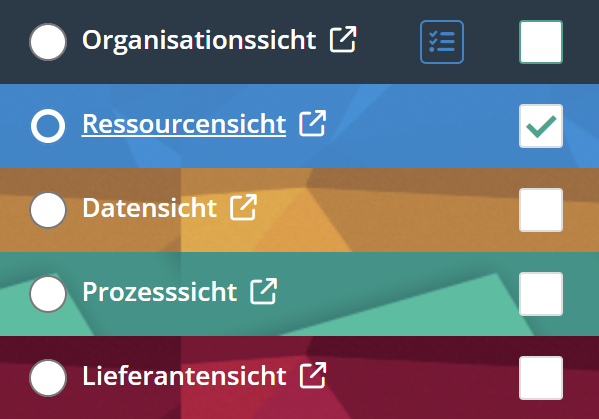 - Die Ressourcensicht stellt die Techniklandschaft dar, die IT-Systeme, Medizinprodukte, Gebäudesicherheit etc. abbildet. Über diese Darstellung erfolgt auch die Risikoanalyse. Hier werden Abweichungen in der Risikobewertung im technischen wie organisatorischen Bereich erkennbar. Daraus sind Maßnahmen zur Behebung der Abweichungen zu planen.