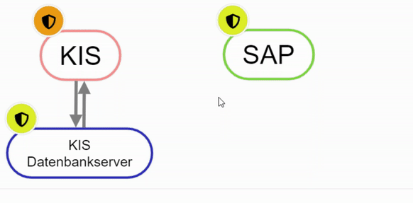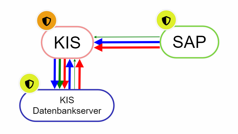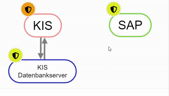 - Ein Krankenhausinformationssystem (KIS) hat eine Schnittstelle ins SAP. SAP ist hinsichtlich des Schutzziels Verfügbarkeit vom KIS abhängig (zwar beträgt die Abhängigkeit nicht 100%, kann aber beispielsweise 30% ausmachen) Dies ist der Fall, da es ohne die Patientenstammdaten, die es vom KIS mehrmals täglich über die Schnittstelle erhält und die bei der Aufnahme eines Patienten im KIS erfasst werden, keine Abrechnung für diesen Patienten vornehmen kann. Das KIS hingegen ist vom SAP unabhängig. Das KIS benötigt aber, um funktionstüchtig zu sein, einen Datenbankserver. Es ist zu 100% von diesem Server abhängig.