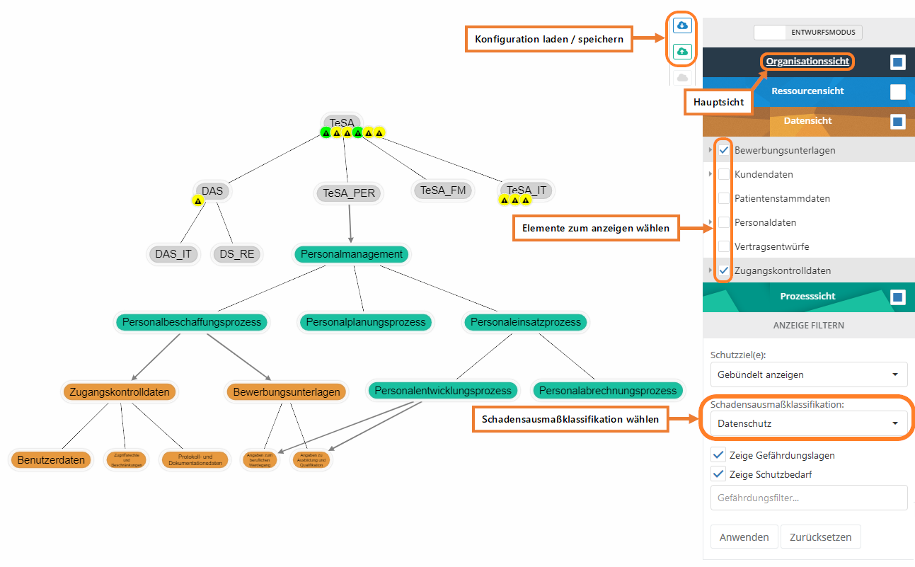 Konfigurationen speichern alle Einstellungen, die zum Speicherzeitpunkt vorhanden waren. Das heißt: Es speichert die Hauptsicht, die Sichten oder Entitäten, die zusätzlich angezeigt wurden, wie die Schutzziele angezeigt werden und ob die Risiken angezeigt werden sollen.