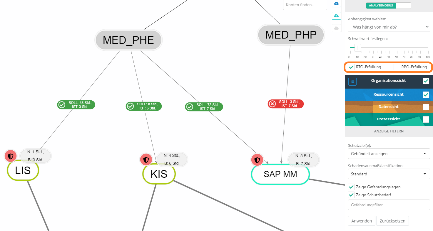 - Um die Erfüllung analysieren zu können, müssen in der Strukturanalyse mindestens die Organisationssicht und die Ressourcensicht ausgewählt werden. Sind diese ausgewählt, muss in den Analysemodus gewechselt werden (Schalter ganz oben im rechten Menü). Im Analysemodus kann nun RTO bzw. RPO-Erfüllung ausgewählt werden.