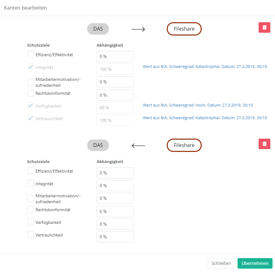 Um die Schutzziele einer Verbindung zu bearbeiten klicken Sie entweder doppelt auf die Verbindungspfeile oder auf das Element und wechseln auf den Reiter "Beziehungen". Bei letzterer Option können keine Gewichtungen eingestellt werden. Hier wird immer von einer 100%-Gewichtung ausgegangen.