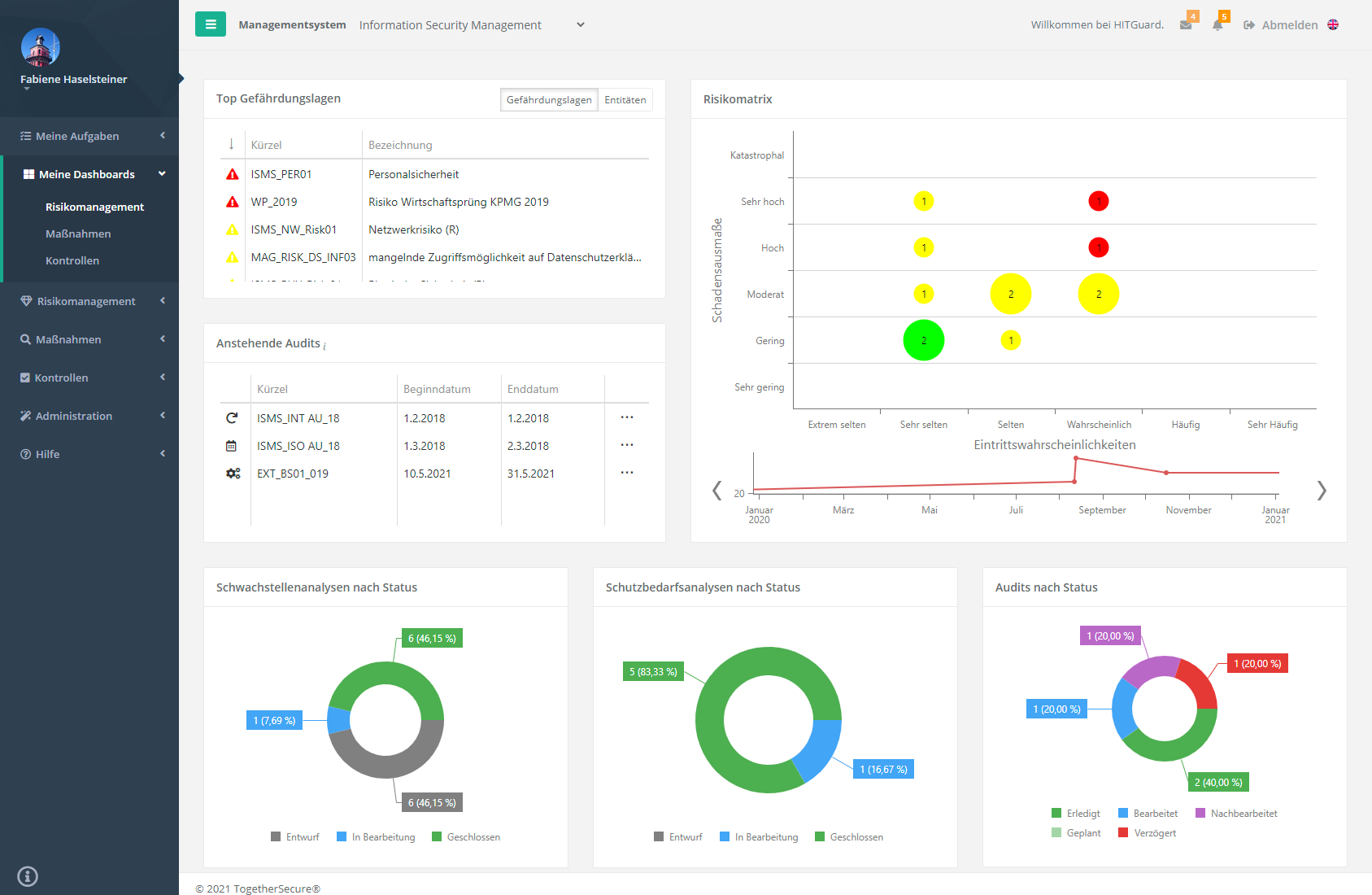 Experten und Professionals bekommen im Risikomanagement Dashboard Auskunft über anstehende Audits, Gefährdungslagen, Compliance Deckung, etc. des Managementsystems. Dafür stehen im Dashboard Key-Performance-Indikatoren (KPIs) zur Verfügung mit denen das Dashboard beliebig angepasst werden kann.